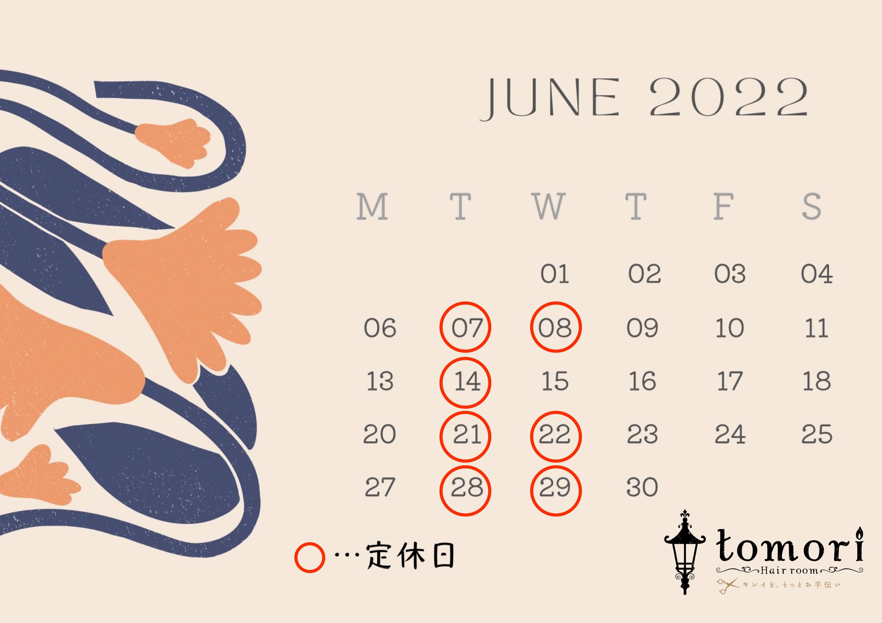 さてトモリヘアルームの6月の定休日のお知らせになりますが