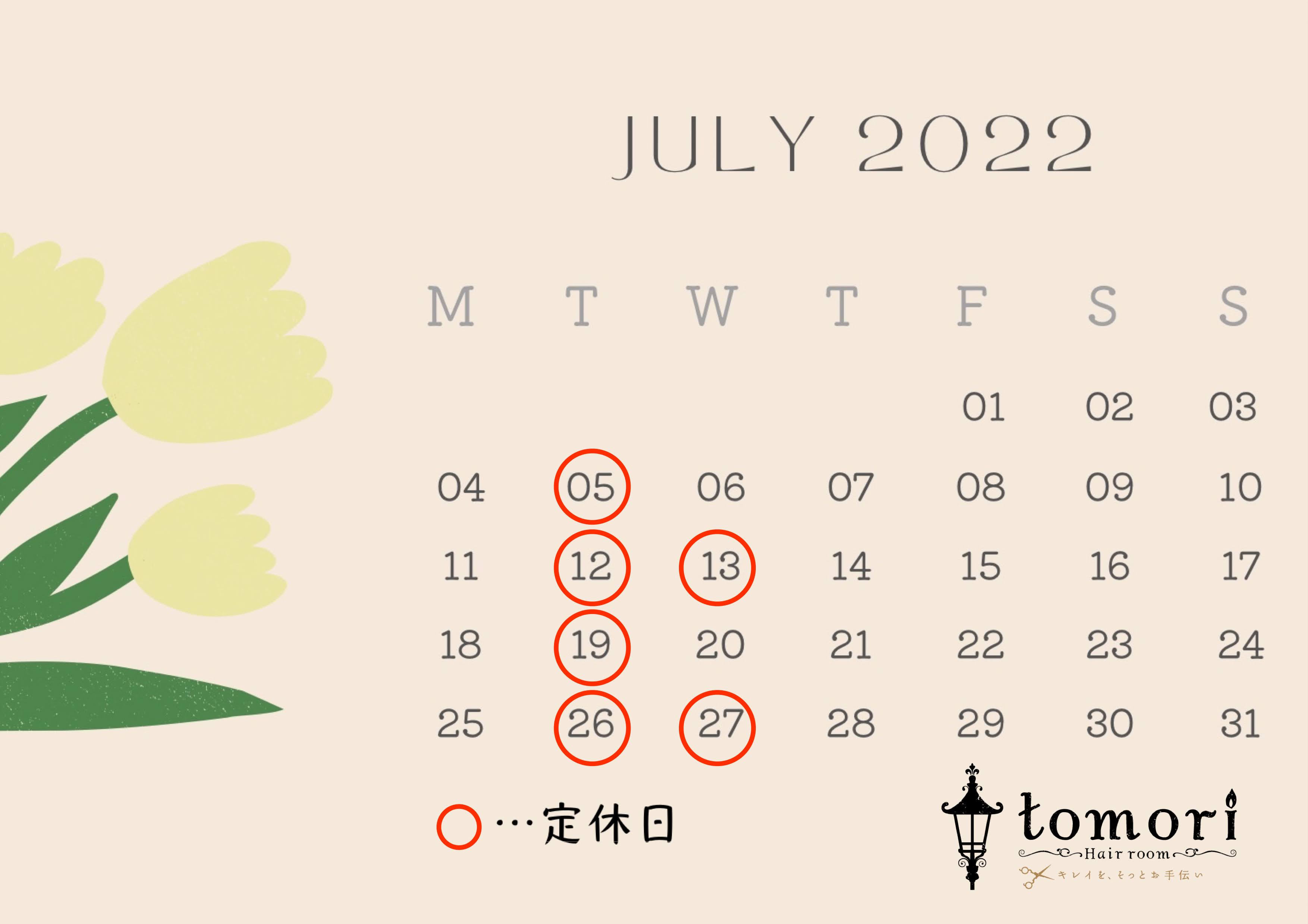 さてトモリヘアルームの7月の定休日のお知らせになりますが