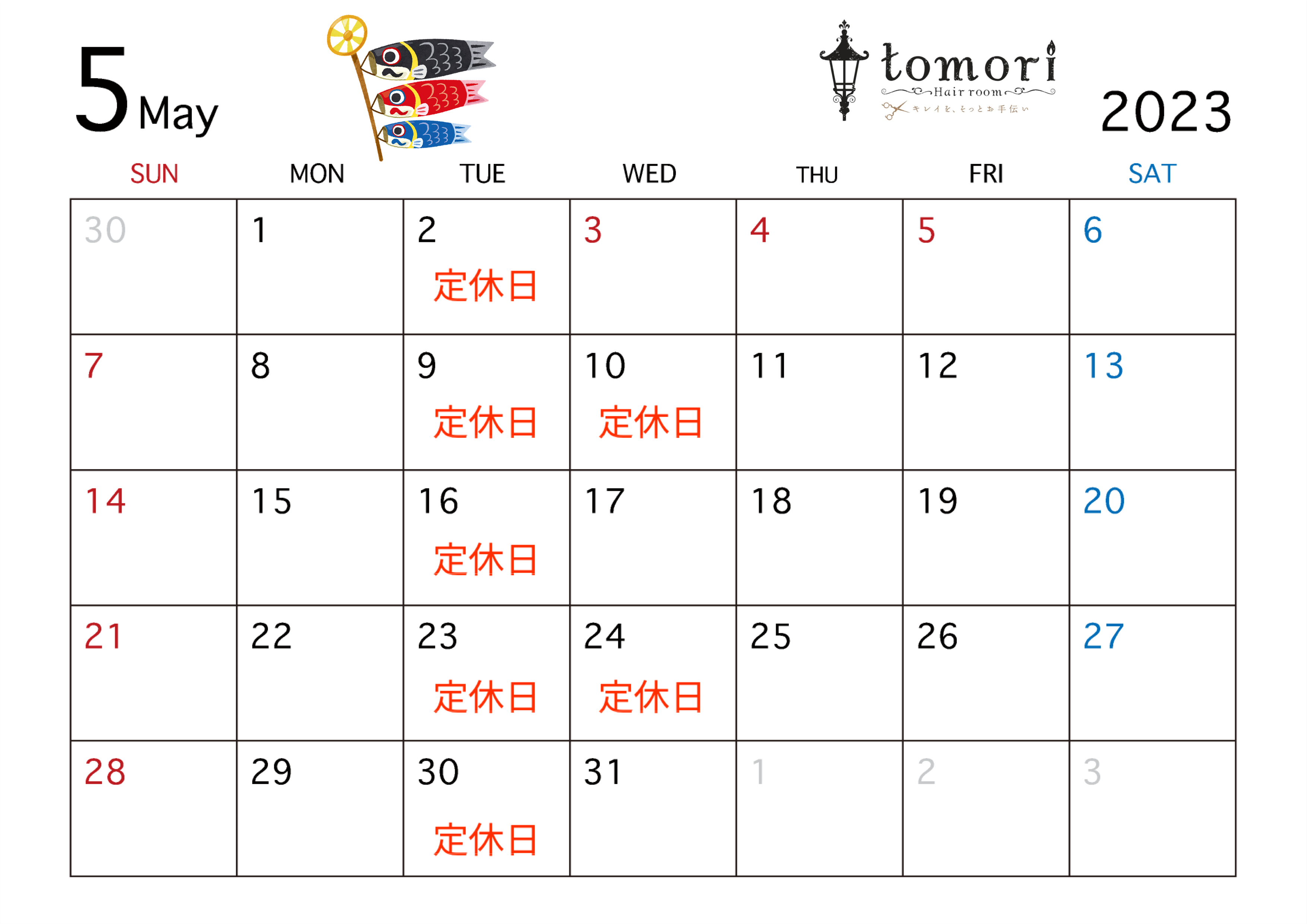 トモリヘアルームの5月の定休日のお知らせになりますが 上記のように、