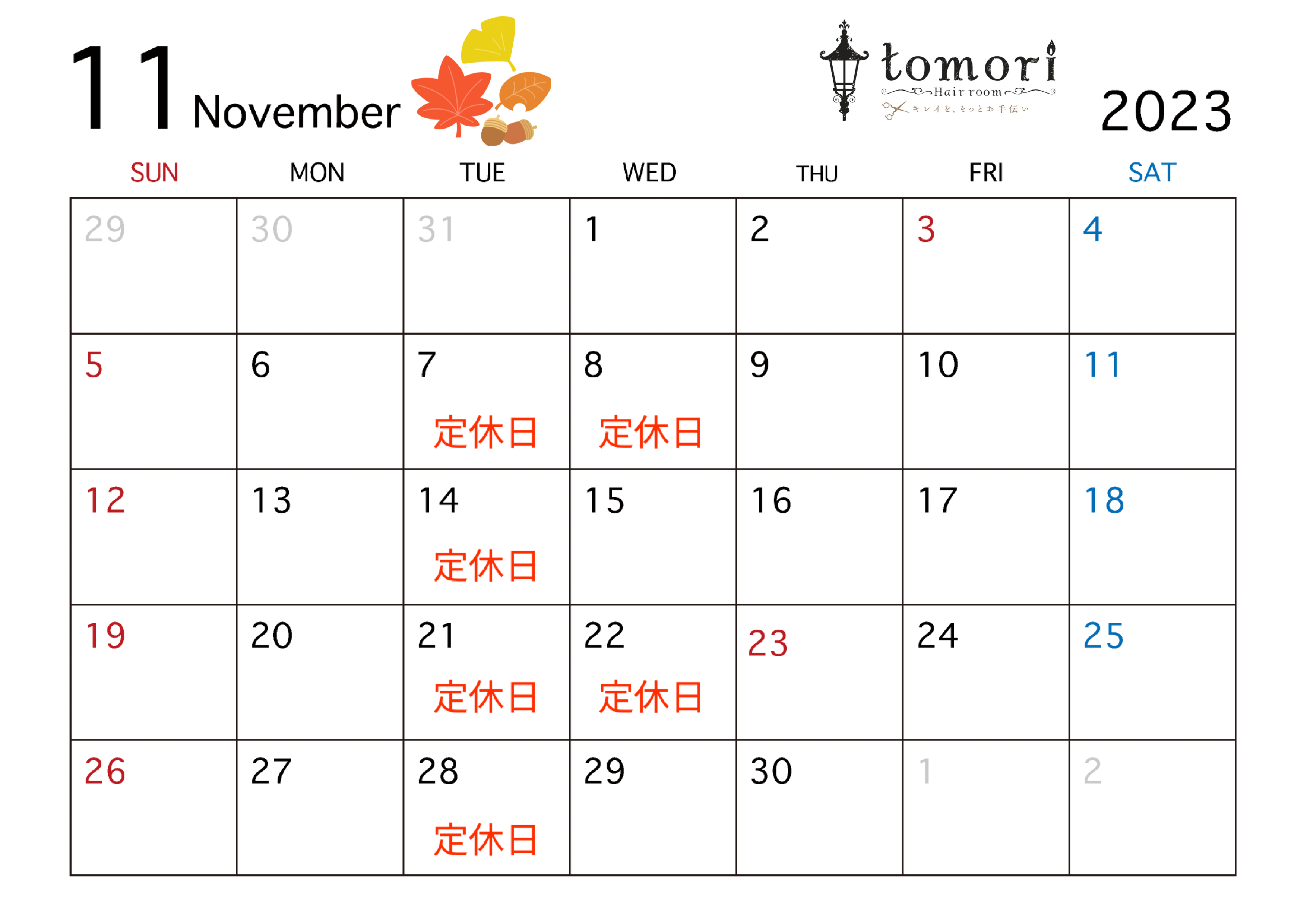 トモリヘアルームの11月の定休日のお知らせになりますが 上記のように、