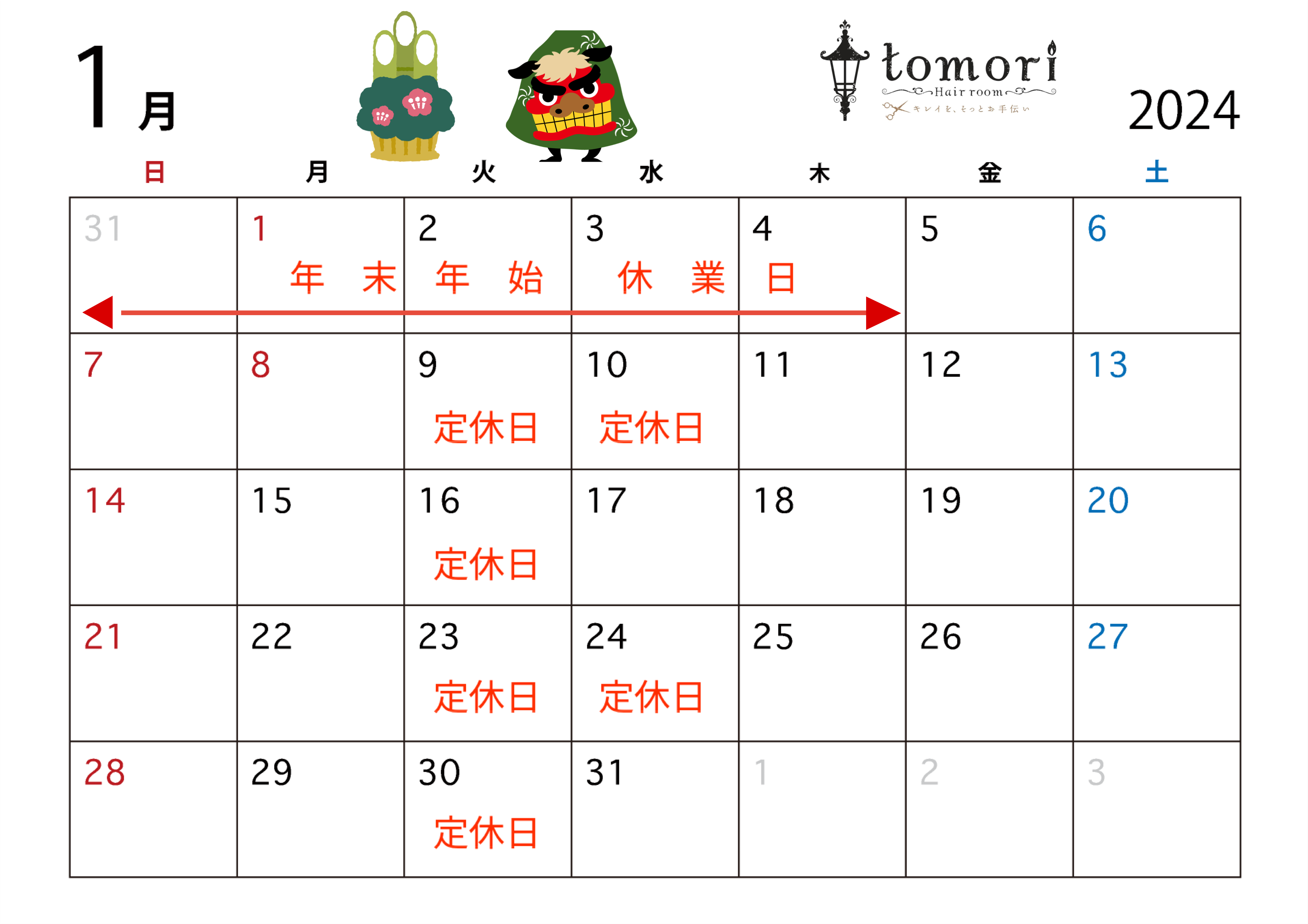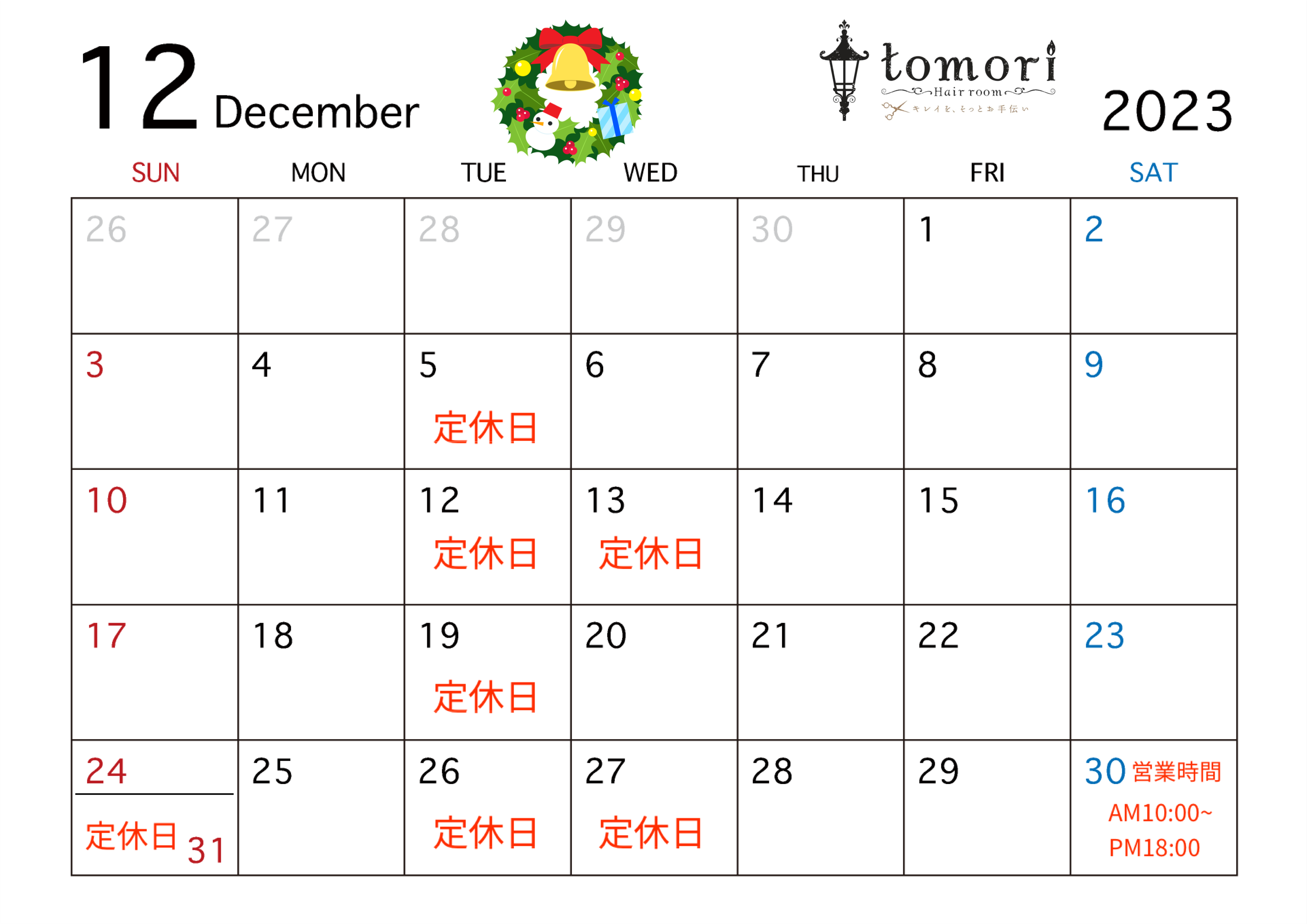 12月・1月の定休日・年末年始休業日のお知らせ|トモリヘアルーム