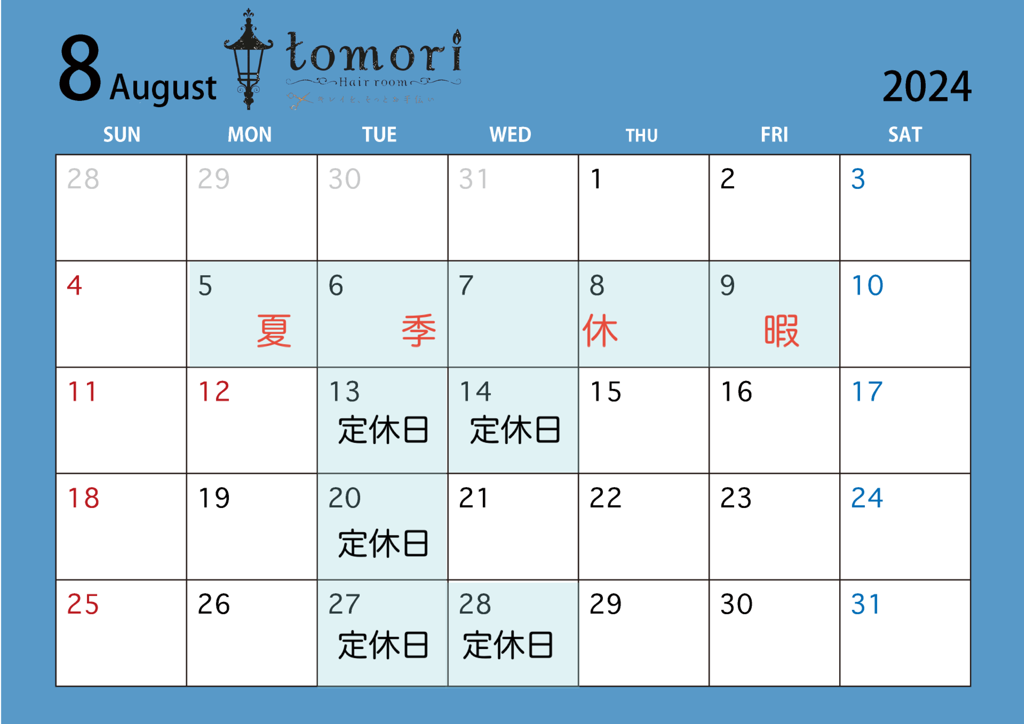 夏季休業・8月の定休日のお知らせ|トモリヘアルーム