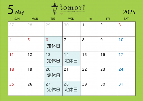 トモリヘアルームの5月の定休日のお知らせになりますが 上記のように、