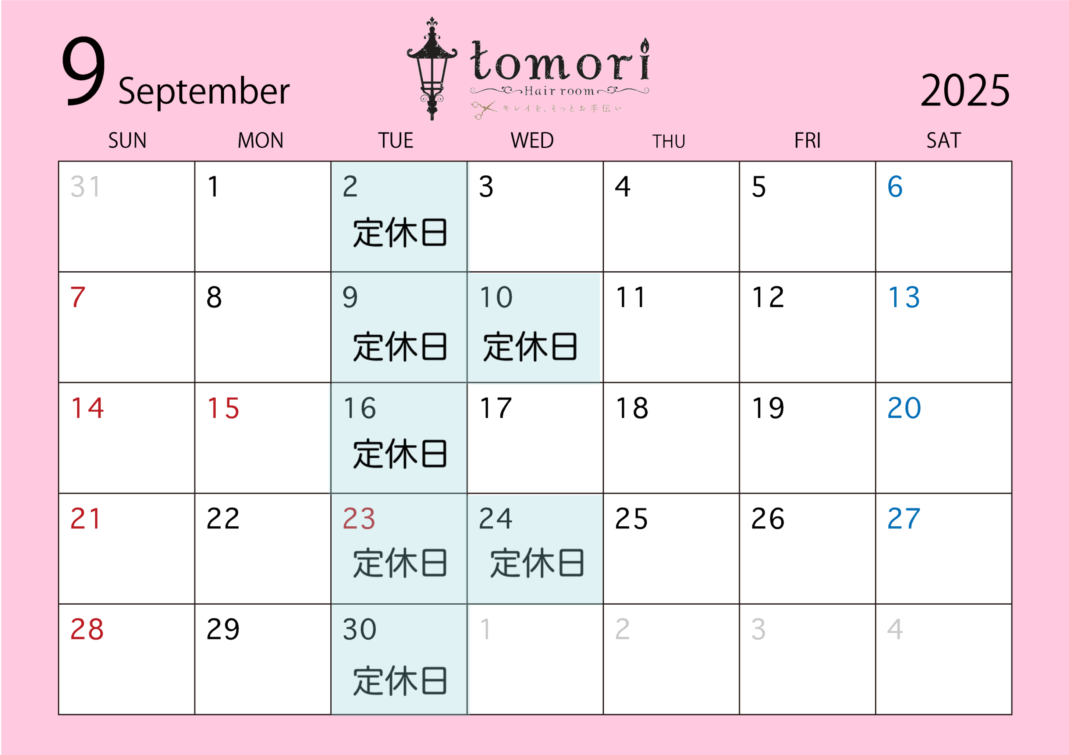 トモリヘアルームの9月の定休日のお知らせになりますが 上記のように、