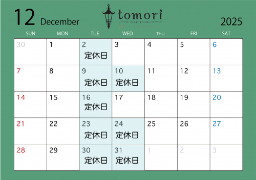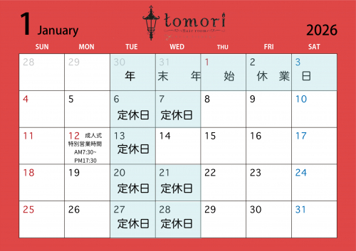 またトモリヘアルームの新年1月の定休日のお知らせになりますが上記の様に、