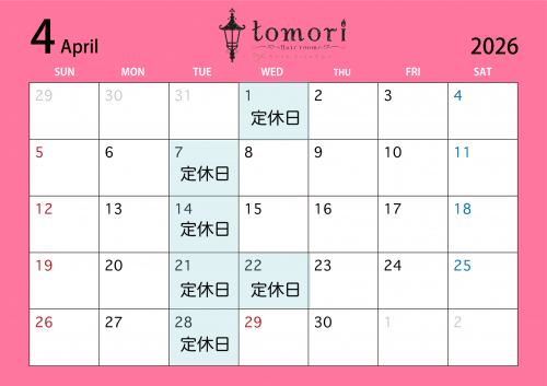 トップ > News 4月の定休日のお知らせ☆tomori Hair room(トモリヘアルーム) 富士見市みずほ台 美容室メテオ正規取扱店