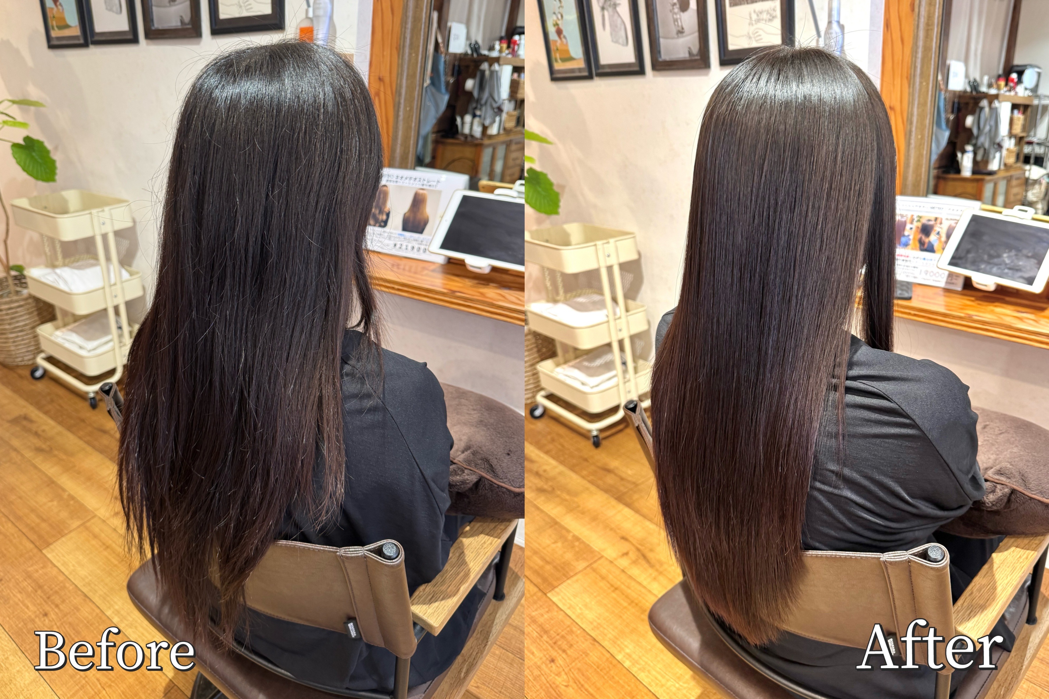極上のツヤ髪とサラサラでしっとり、いつまでも触っていたい指通りの良い極上の髪質へ仕上げます。自然でふんわり弾力ある髪へも変化します。